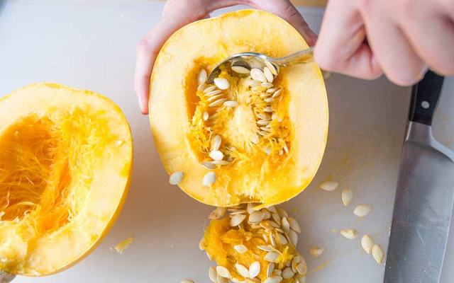 - Wash the skin of the squash. Cut the squash in lengthwise from stem to tail (if the stem is just too arduous to chop around, trim the ends). Use a spoon to scoop out and discard seeds from the center of every.
